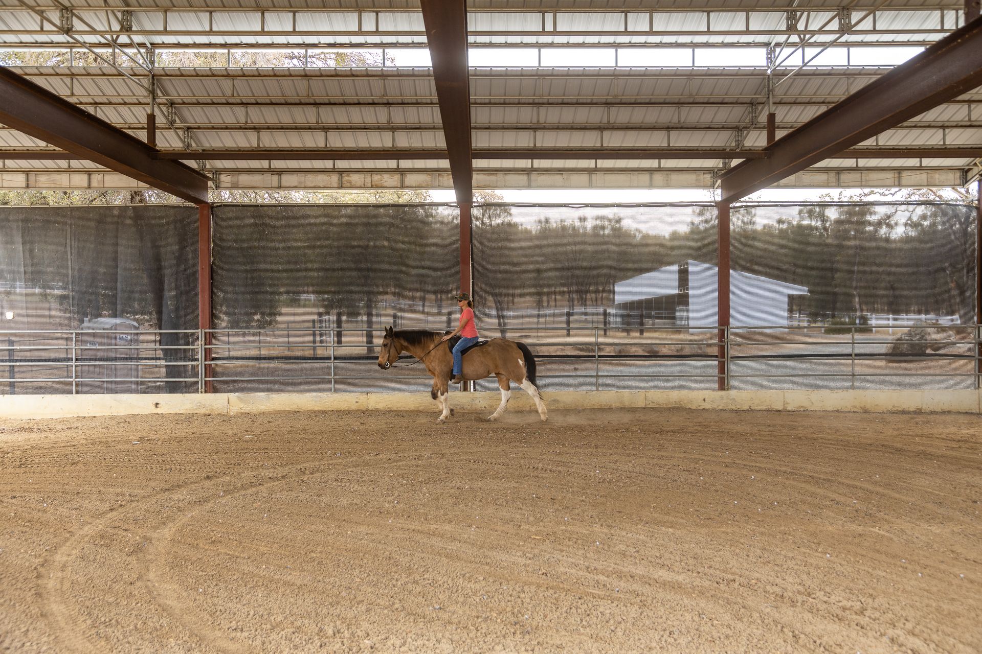 - Covered arena measuring approx. 42'x40' with an attached storage bay for RV or hay