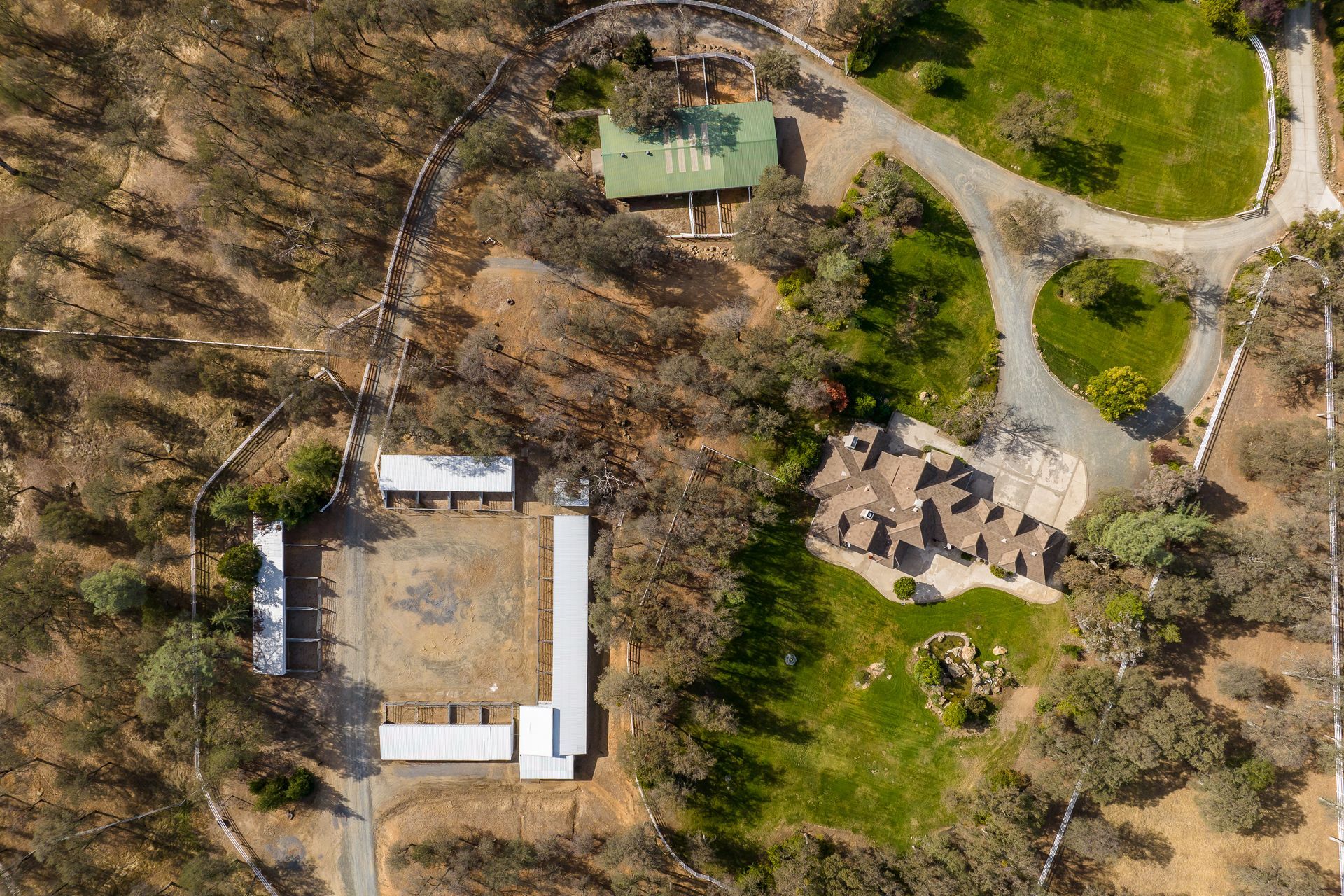 - Gated access to circular driveway in front of home and another gate on the side of property for horse trailers and delivery vehicles