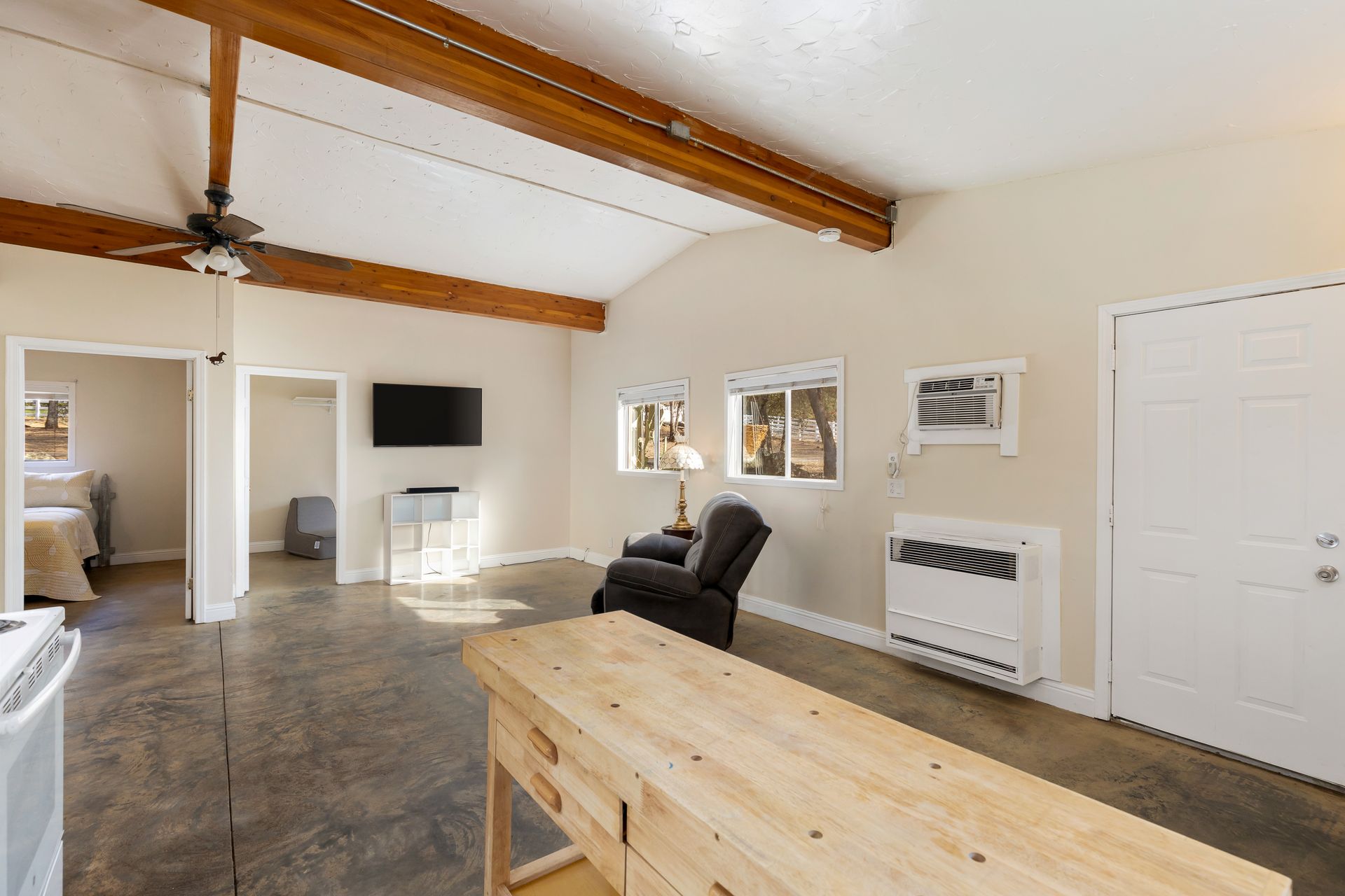 - Great room with vaulted ceilings, exposed beam and wall closet