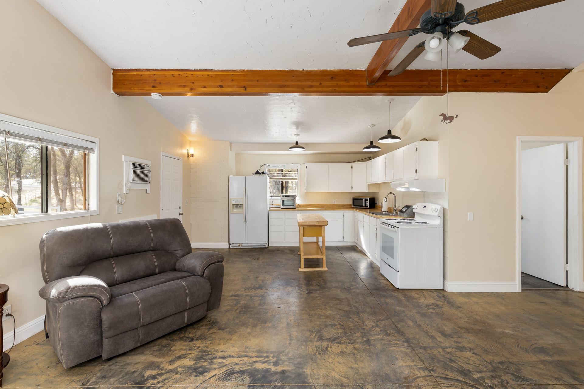 - Full kitchen: electric stove, hood, upper and lower cabinets, double sink, refrigerator, overhead pendant lighting