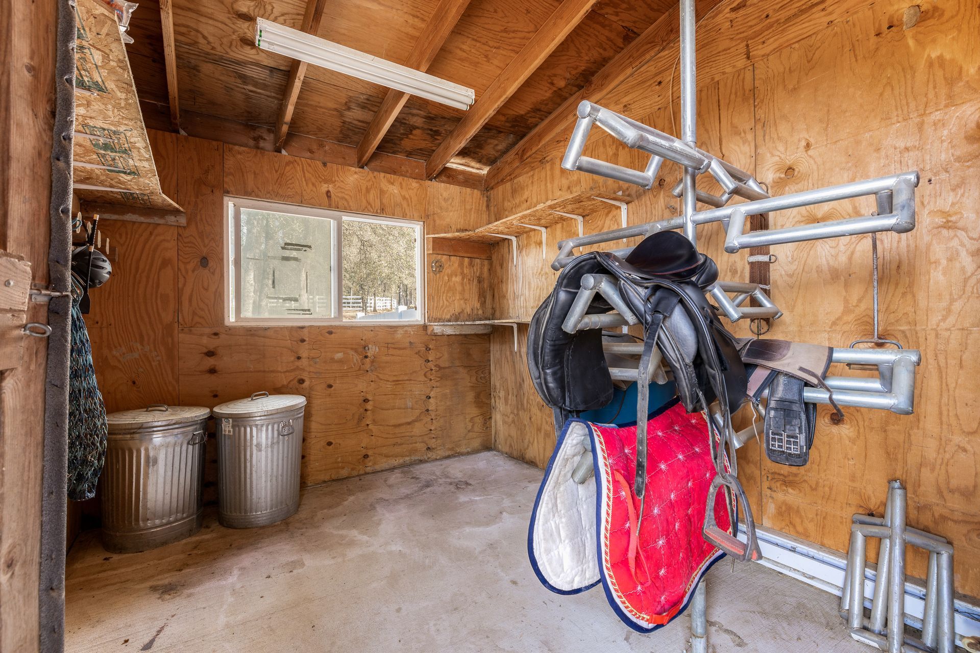 - Shed row barn with up to 17 pipe panel stalls and feeders, two storage bays, building with an enclosed stall, 2 shoots, washer/ dryer, shelving, sink, electrical, and tool shed