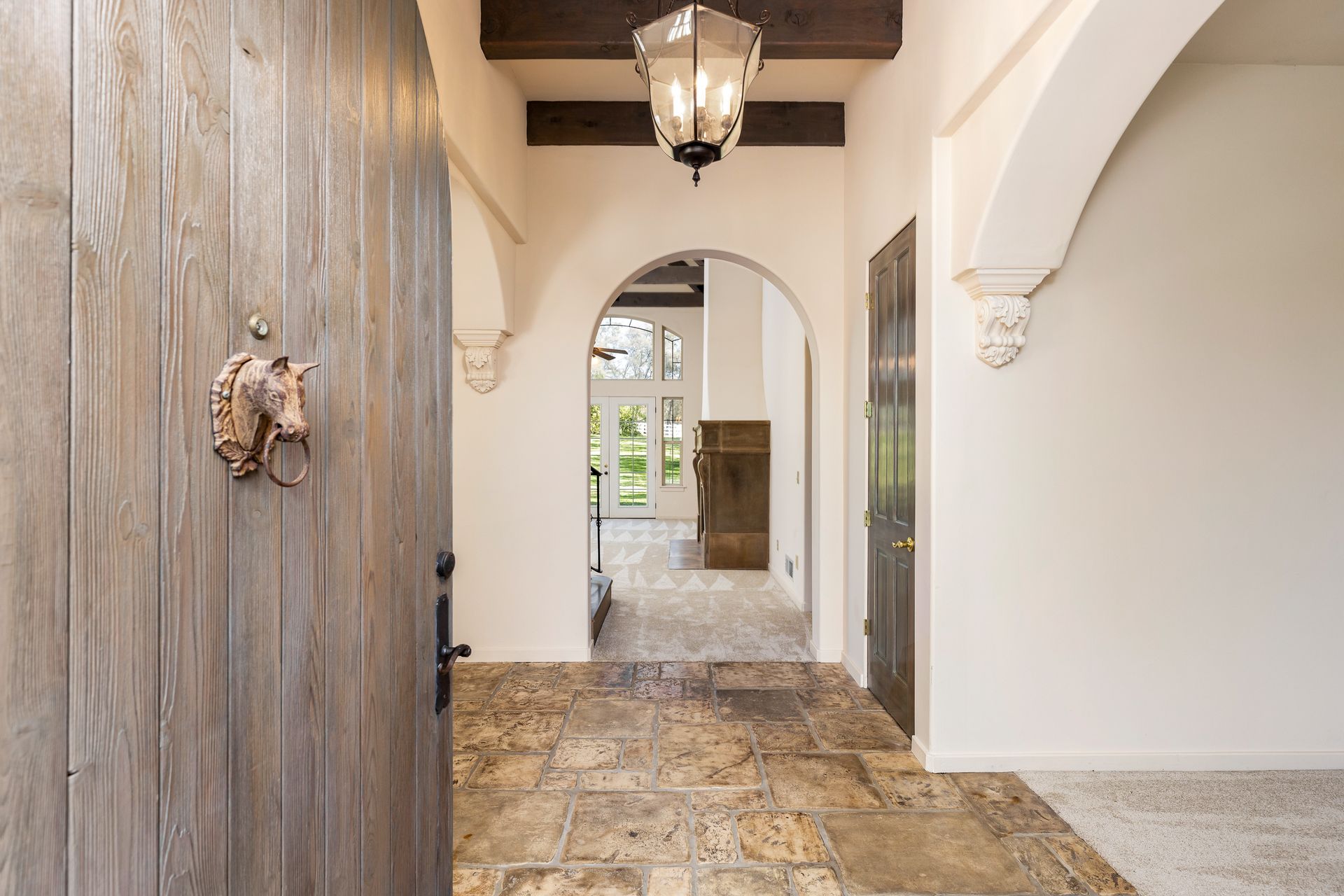 - Formal entry with beam ceiling, chandelier and custom made arched front door