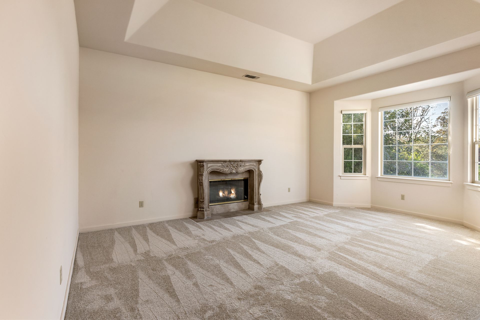 - Living room with 14' coffered ceilings, large bay window and a wood burning fireplace designed by Sylvestri's