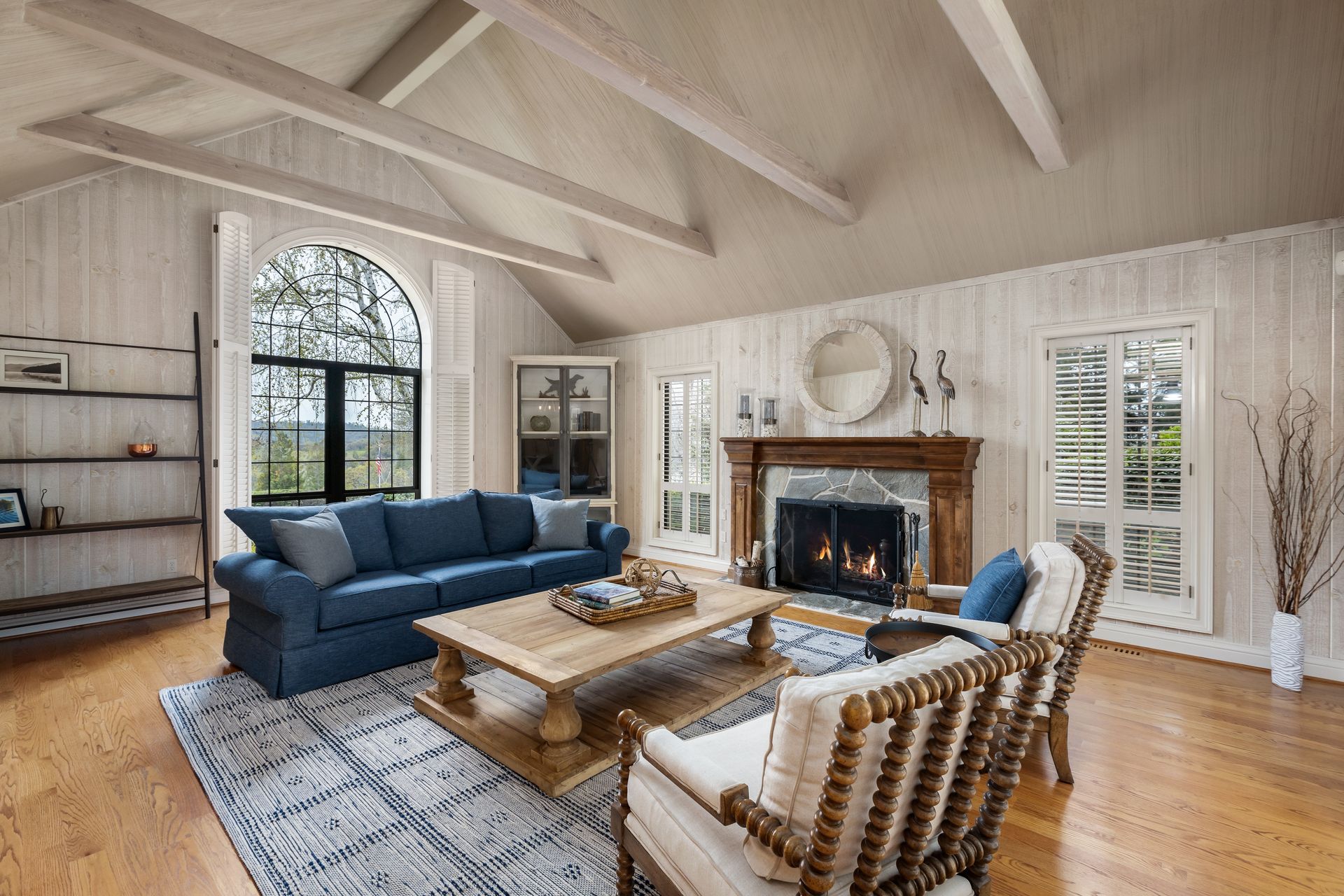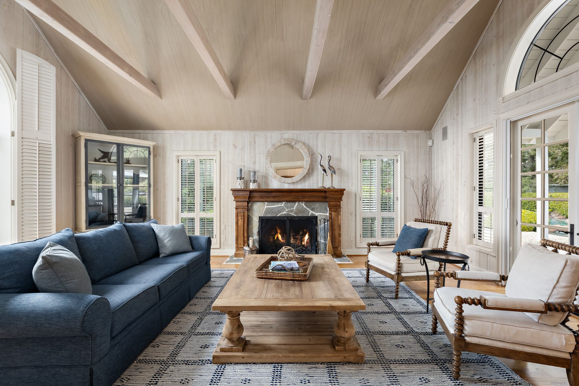 The entry is flanked by a large bright office/library on the right, the living room on the left and the formal dining area straight ahead. The office features custom knotty pine double doors, a tray ceiling with white shiplap inlay and a wood burning fireplace, to cozy up to with a good book. What better way to wrap up your work day than to watch the sunset through the forward-facing windows from the custom built in wood desk with conjoining wall to wall white desks, drawers and upper cabinets.