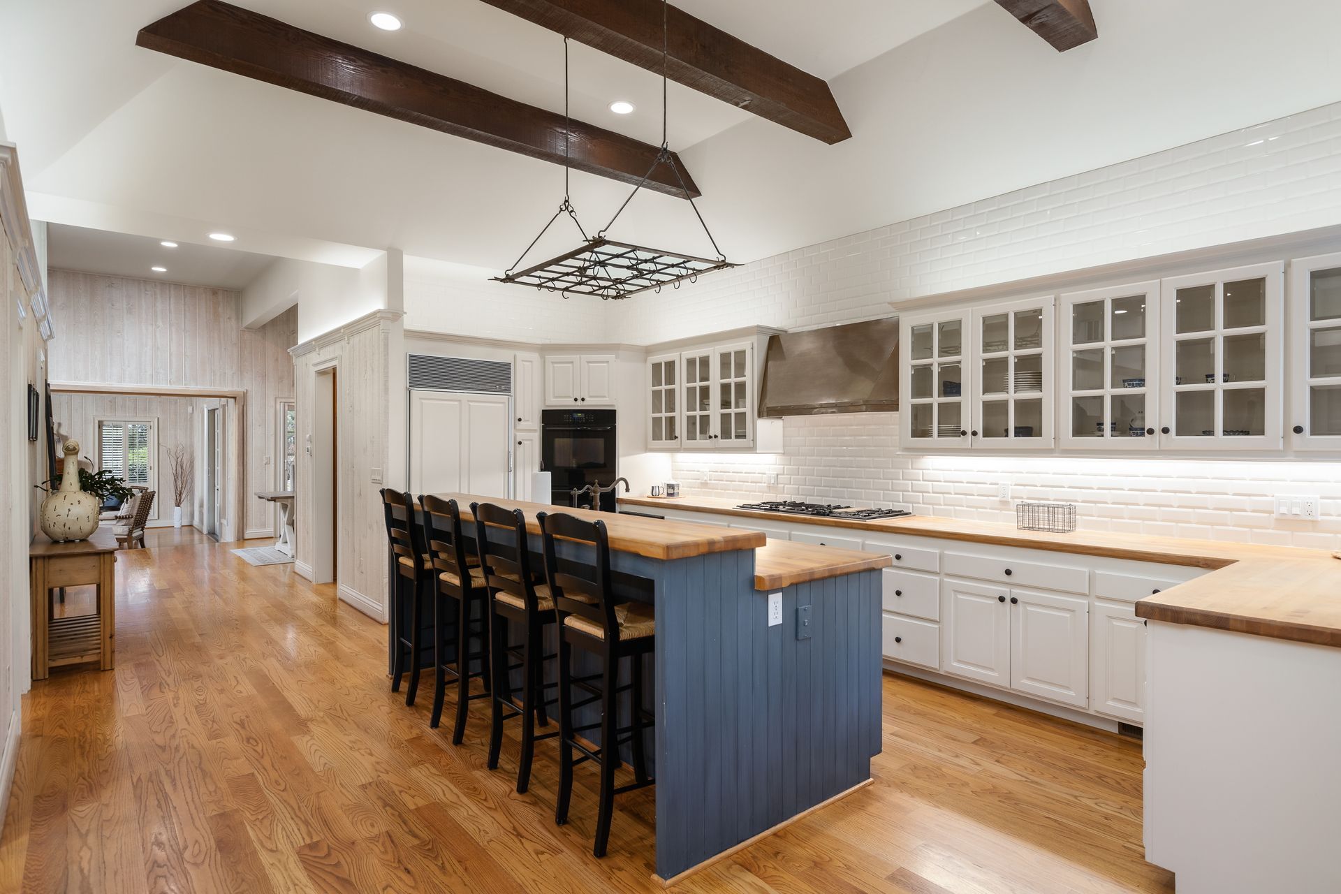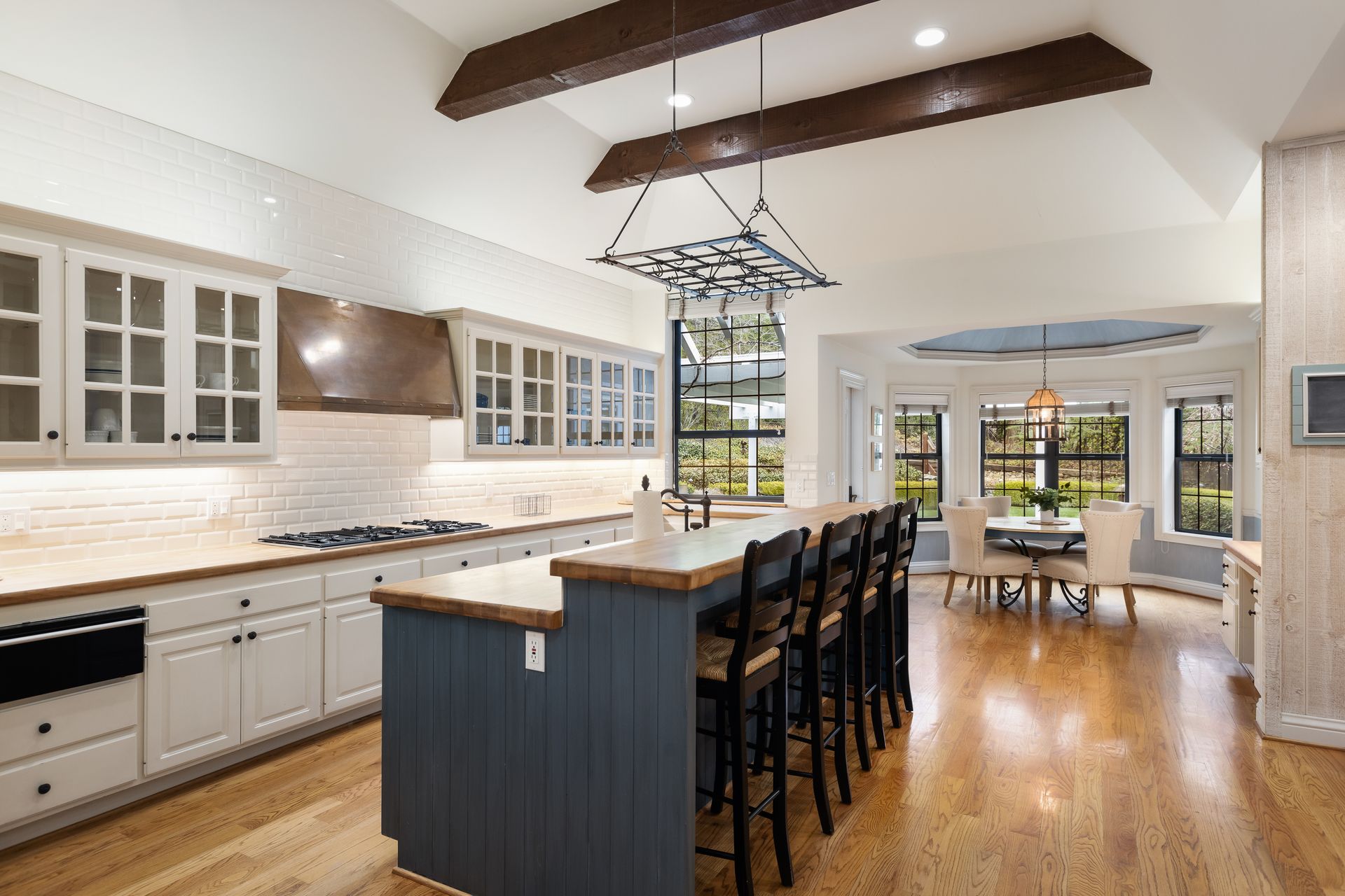 The spacious chef's kitchen with exposed beams, up and down lighting and an abundance of white cabinetry with glass uppers, features a gas 6 burner cooktop with a copper hood, built in Sub-Zero refrigerator, double ovens, a walk-in pantry, and a center island with a sink, dishwasher and dine up bar for four. The adjacent breakfast nook with a glass door and windows to enjoy the side yard and covered patio (with wisteria and a fountain), has a stunning hand painted turret ceiling. There is a guest powder room with a custom wood basin with copper sink anda laundry room with cabinets, sink and ironing board.