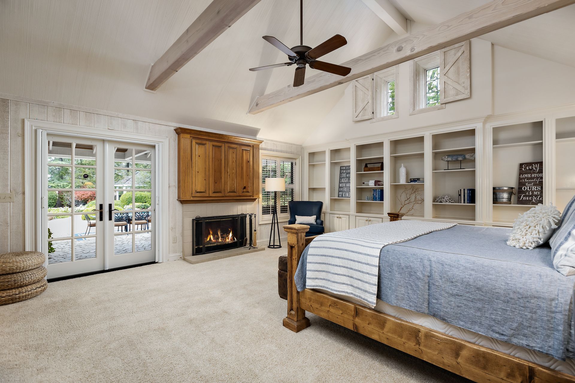 Around the corner through a small hallway lined with bookcases, is the spacious master suite featuring cathedral ceilings, a wood burning fireplace, a wall-to-wall bookcase, dormer windows with beveled glass windows, a full bath with double sinks and walk in shower. There is also a large walk-in closet with built in's.